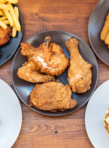 Homemade crumbed chicken breast topped with smoked BBQ sauce, triple smoked leg ham, salami, bacon, and melted mozzarella cheese served with steak-cut chips.